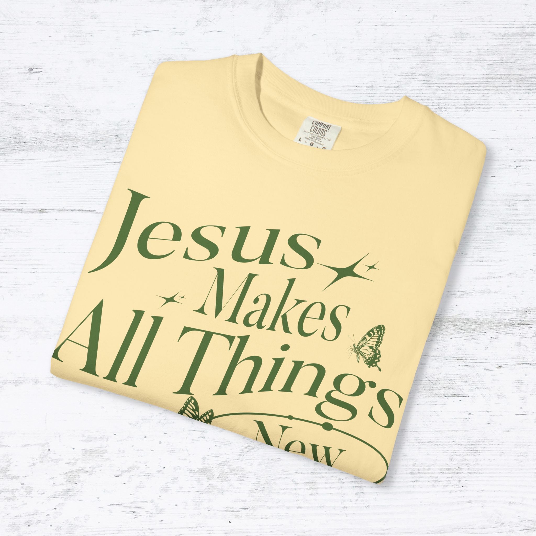 Step into the promise of renewal with our “Jesus Makes All Things New” tee, inspired by Revelation 21:5.