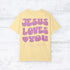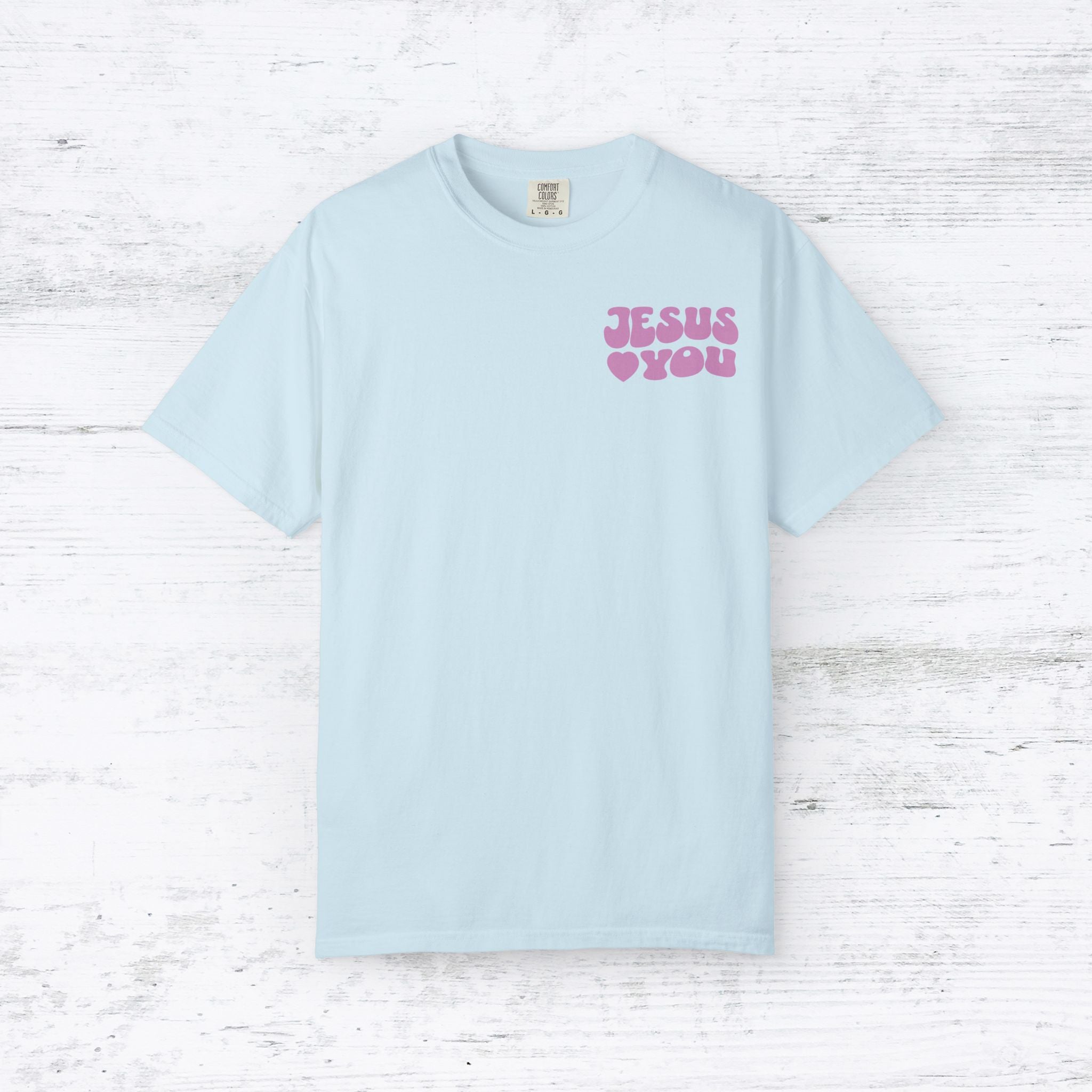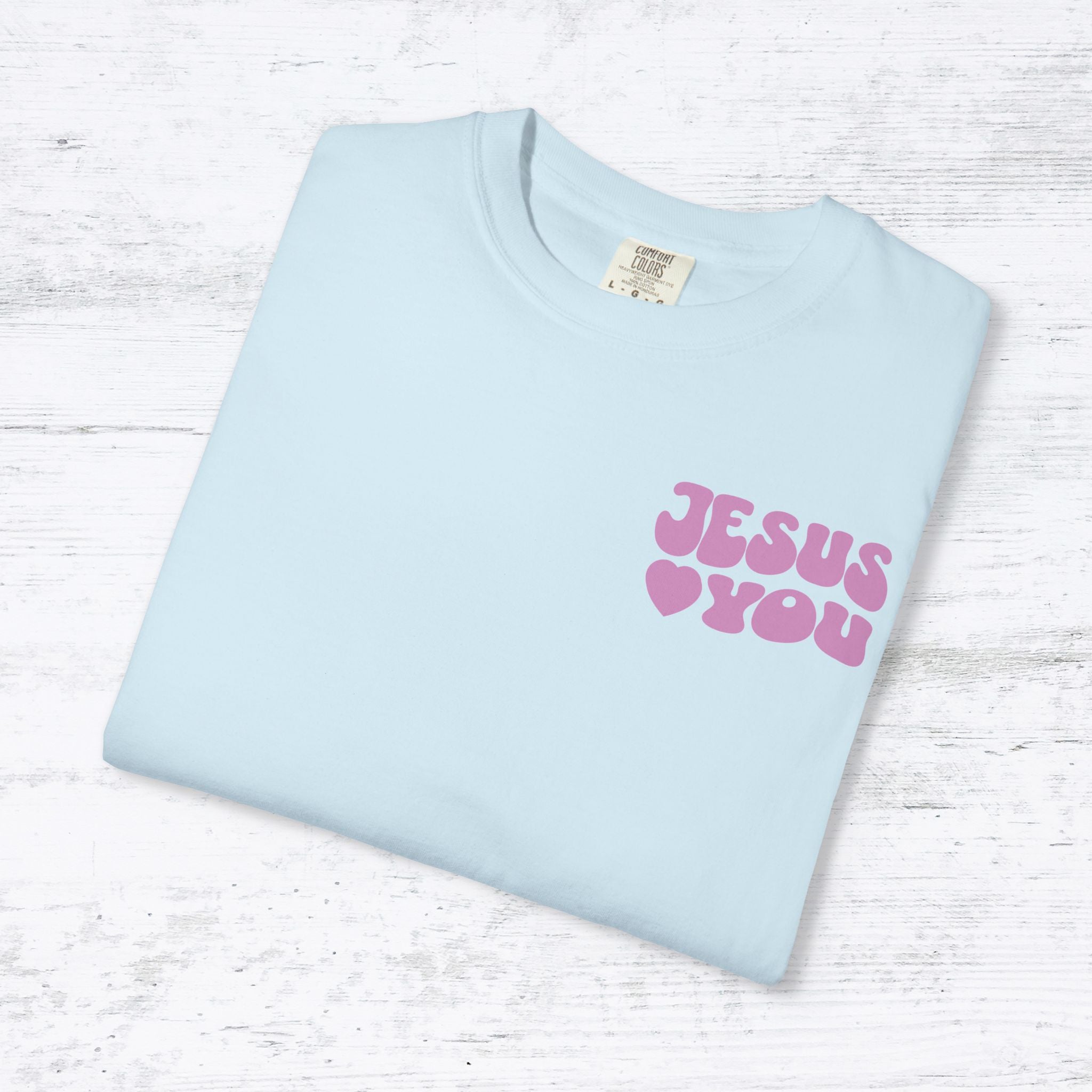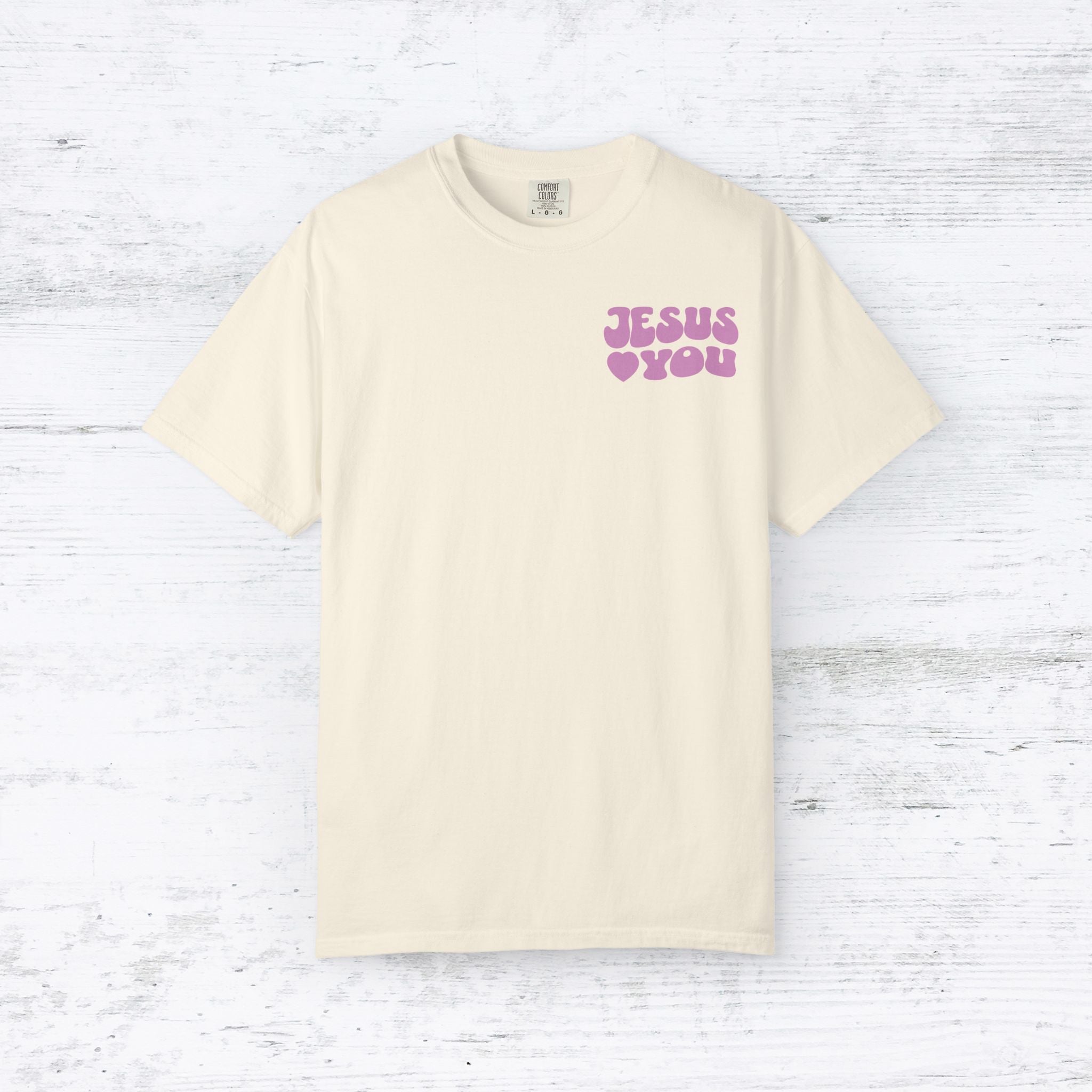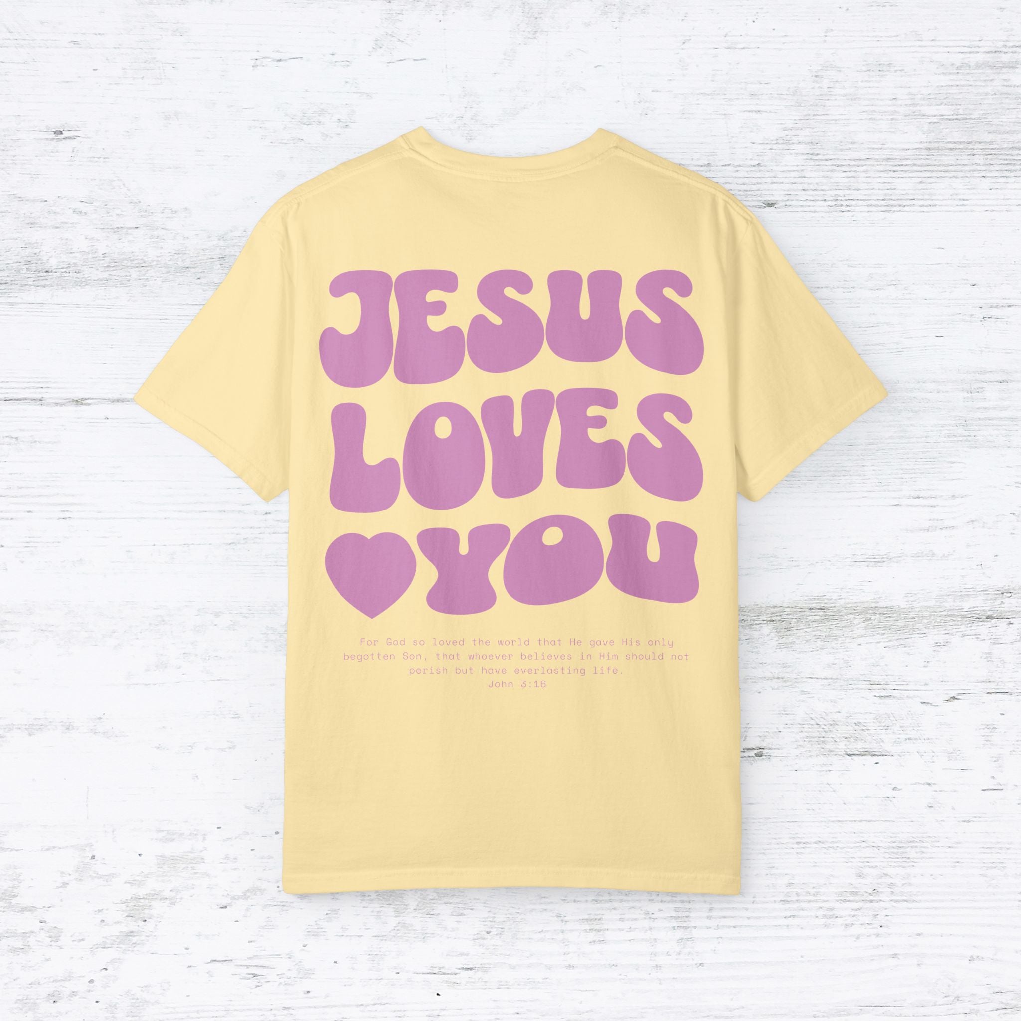 This Comfort Colors 1717 tee carries the heart of the gospel both front and back. The front declares Jesus Loves You in bold lettering, while the back features the full Scripture of John 3:16 — “For God so loved the world that He gave His one and only Son, that whoever believes in Him shall not perish but have eternal life.”